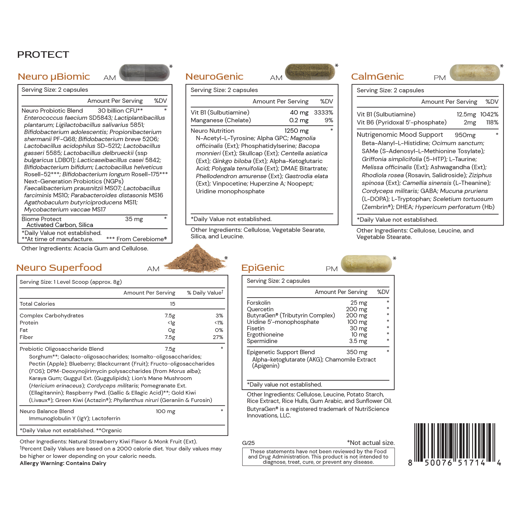 Protect combines Neuro µBiomic, NeuroGenic, Neuro Superfood, CalmGenic, and EpiGenic.